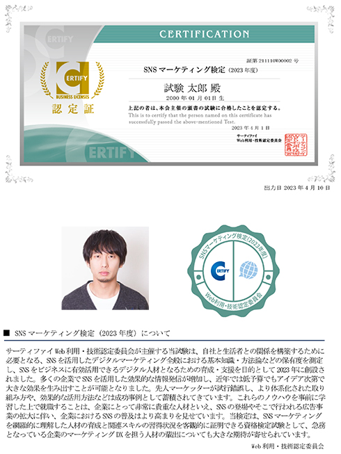合格された方には、「オープンバッジ」の交付に加え、「デジタル認定証明書」が交付されます。